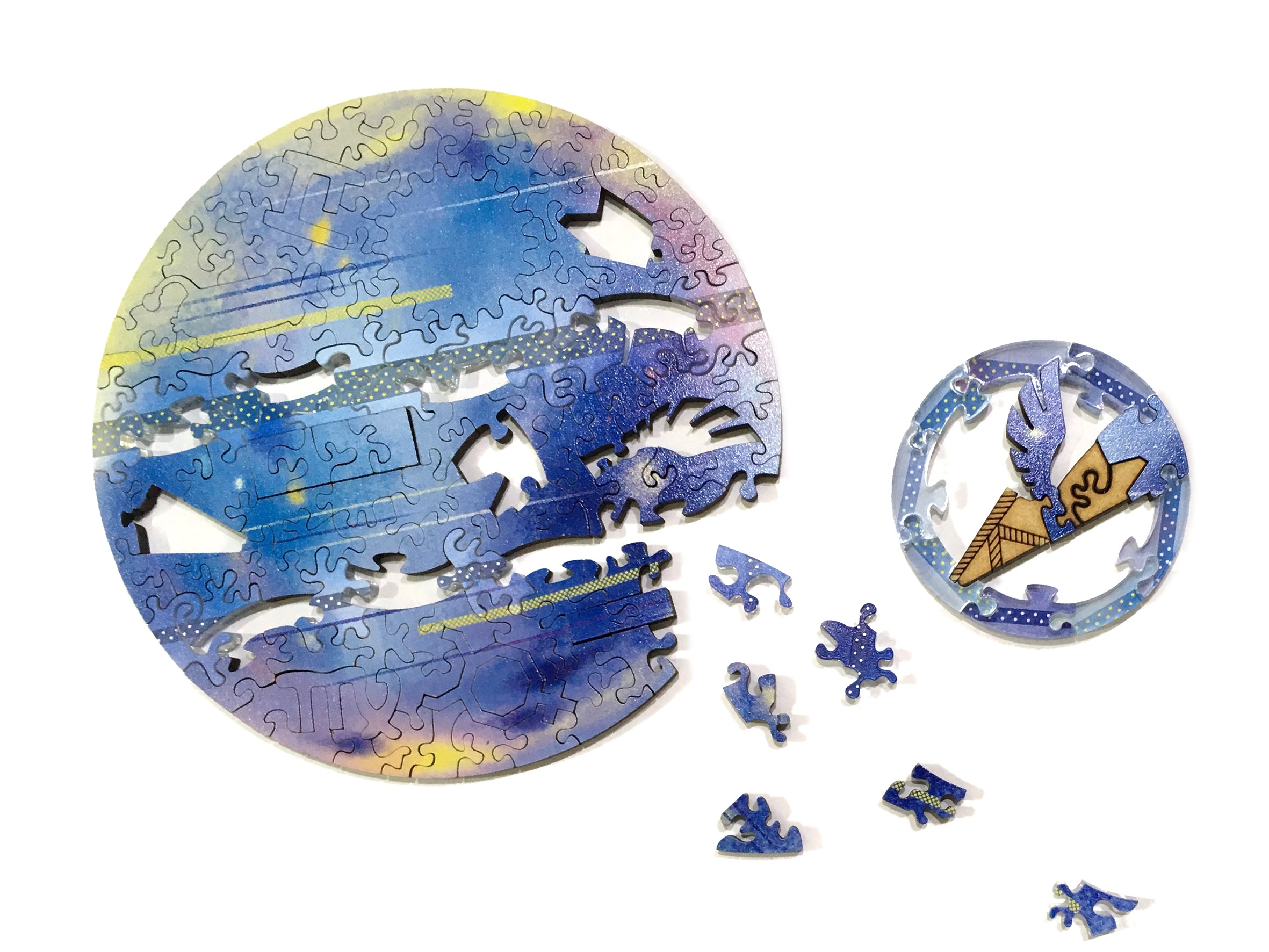 Introducing Hellofish's innovative patented puzzle! Certain pieces of the large puzzle can be reassembled into a mini puzzle! Each mini puzzle features representative elements of individual planets.